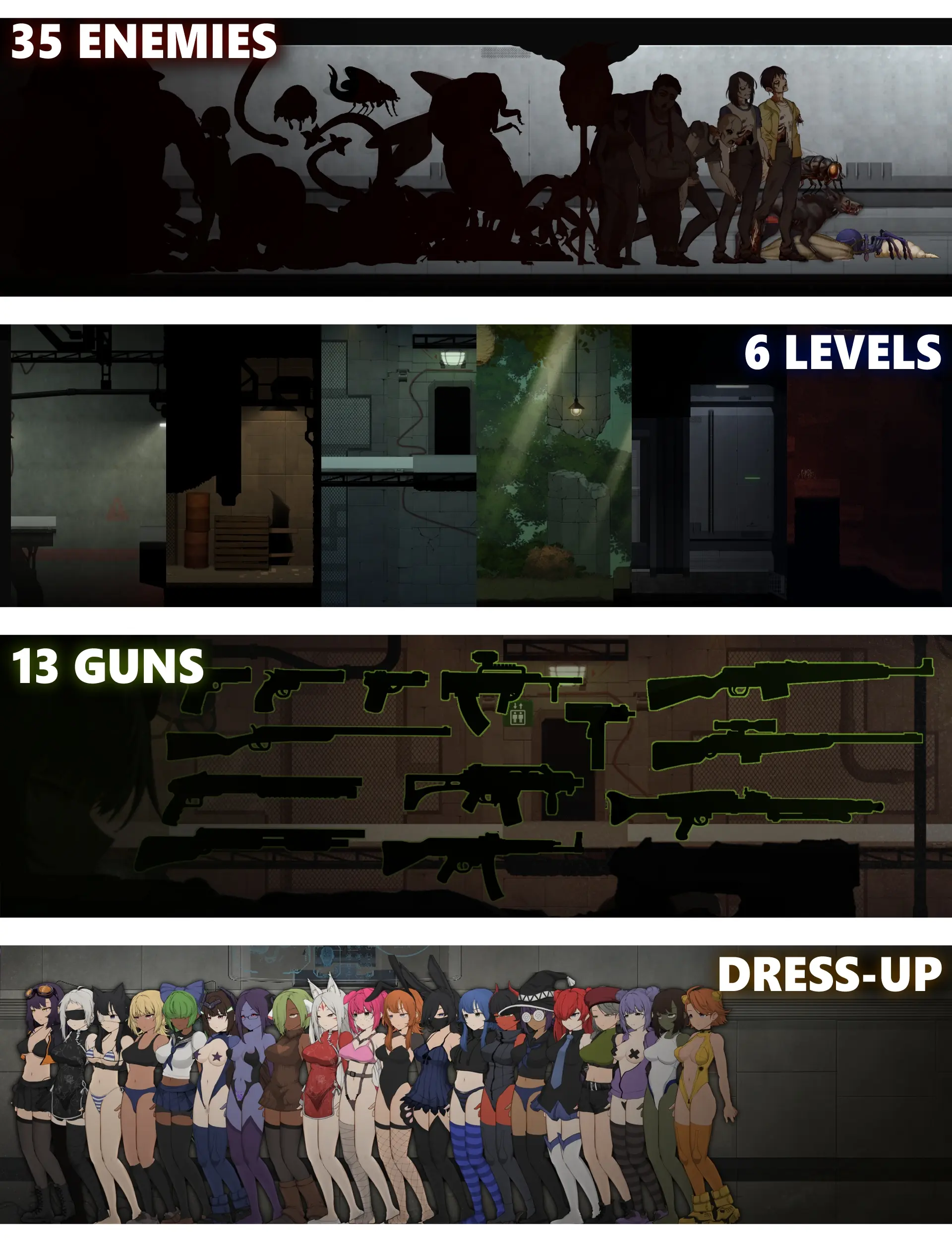 精心打造。遊戲包含超過 35 種獨特的敵人類型,包括感染者(殭屍)、變異昆蟲、觸手、寄生蟲和外星人。所有敵人均採用流暢的多階段 H 動畫,並使用 Spine 2D 技術實現。 –